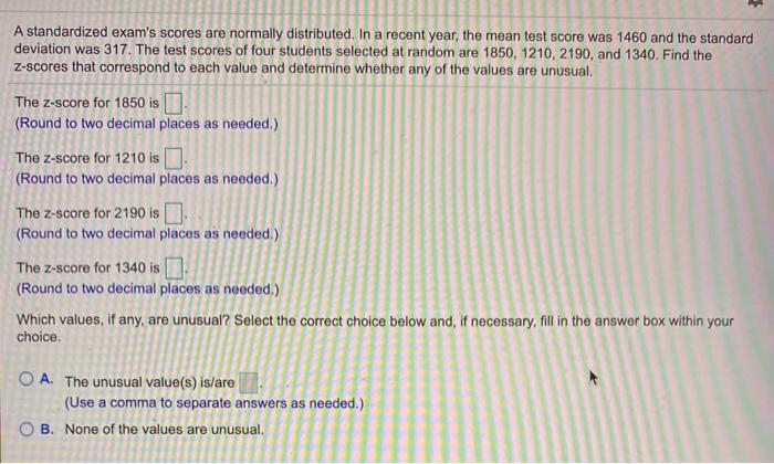 Solution Scores On A Standardized Test Are Normally Distributed With A Mean Of 550 And Standard Deviation Of 140 Convert To A Z Score And Use A Table To Find The Following The